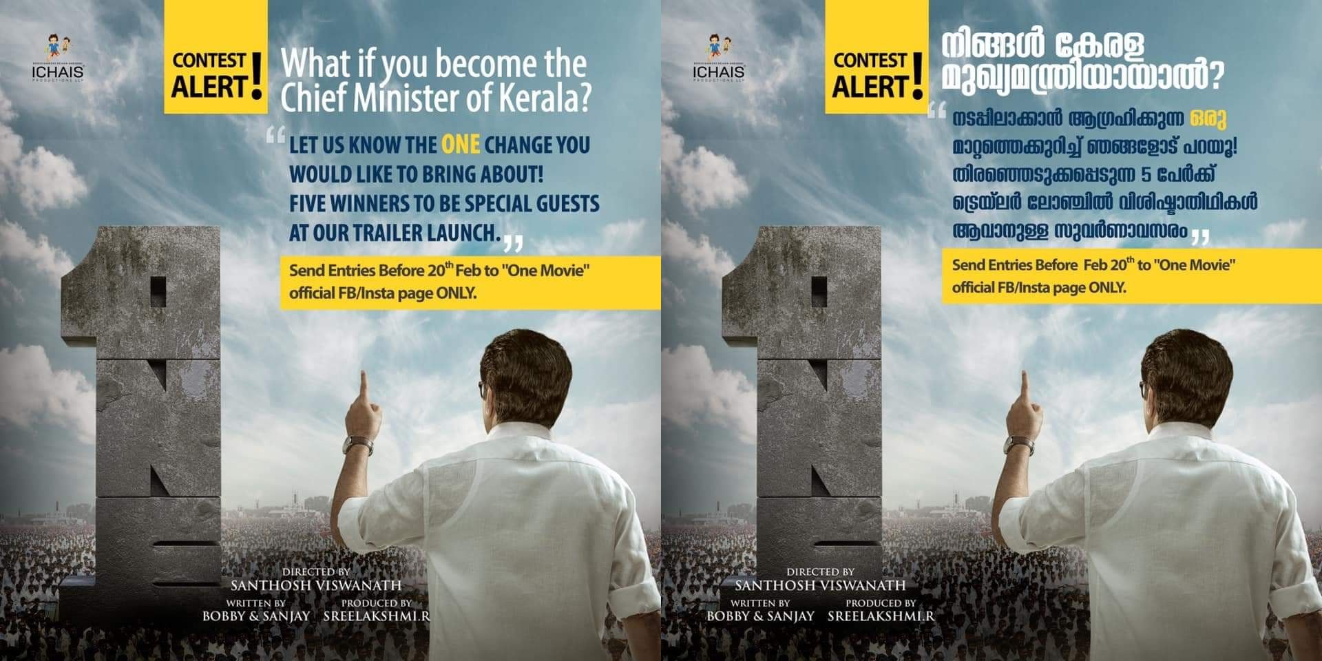 Mammootty movie ” 1 ” contest at social media, what if you become the chief minister of Kerala ?. let us know the One change you would like to bring about. fiver winners to be special guests a out trailer launch . Send entries before 20th february via One Movie official FB/Insta page only.