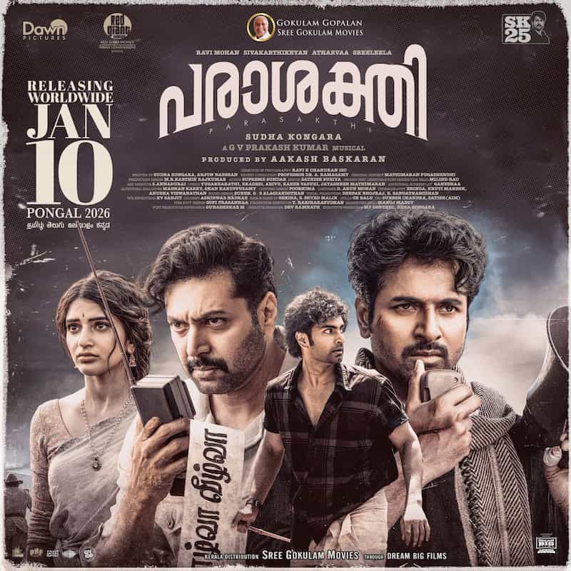 ശിവകാർത്തികേയനും രവി മോഹനും പ്രധാന വേഷത്തിലെത്തുന്ന ‘പരാശക്തി’ യുടെ കേരളാ വിതരണാവകാശം ശ്രീ ഗോകുലം ഗോപാലന്റെ ശ്രീ ഗോകുലം മൂവീസ് കരസ്ഥമാക്കി. സുധ കൊങ്കര സംവിധാനം ചെയ്യുന്ന പരാശക്തി പീരിയഡ് ഡ്രാമയാണ് ഒരുക്കിയിരിക്കുന്നത്.അഥർവയും ശിവകാർത്തികേയനും സഹോദരന്മാരായാണ് ചിത്രത്തില് എത്തുന്നത്. തെലുങ്ക് താരം ശ്രീലീലയും പ്രധാന വേഷത്തില് ചിത്രത്തില് എത്തുന്നു. പൊങ്കൽ റിലീസായി പരാശക്തി ജനുവരി 10ന് ലോകവ്യാപകമായി തിയേറ്ററുകളിലേക്കെത്തും. ശ്രീ ഗോകുലം മൂവീസിന്റെ ഒഫീഷ്യൽ ഡിസ്ട്രിബൂഷൻ പാർട്ട്നറായ ഡ്രീം ബിഗ് ഫിലിംസാണ് ചിത്രം കേരളത്തിലെ തിയേറ്ററുകളിലേക്കെത്തിക്കുന്നത്.