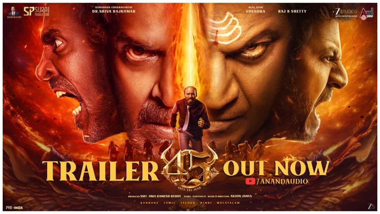 കന്നഡ സൂപ്പർ താരങ്ങളായ ശിവരാജ് കുമാർ, രാജ് ബി ഷെട്ടി, ഉപേന്ദ്ര എന്നിവരെ പ്രധാന കഥാപാത്രങ്ങളാക്കി പ്രശസ്ത കന്നഡ സംഗീത സംവിധായകൻ അർജുൻ ജന്യ രചിച്ചു സംവിധാനം ചെയ്ത പാൻ ഇന്ത്യൻ ചിത്രം “45 ” ൻ്റെ ട്രെയ്ലർ പുറത്ത്. അർജുൻ ജന്യ സംവിധായകനായി അരങ്ങേറ്റം കുറിക്കുന്ന ഈ ചിത്രം നിർമ്മിച്ചിരിക്കുന്നത് സൂരജ് പ്രൊഡക്ഷൻസിന്റെ ബാനറിൽ ശ്രീമതി ഉമാ രമേശ് റെഡ്ഡി, എം രമേശ് റെഡ്ഡി എന്നിവർ ചേർന്നാണ്. ചിത്രത്തിന് സംഗീതം നൽകിയിരിക്കുന്നതും സംവിധായകനായ അർജുൻ ജന്യ തന്നെയാണ്. ഡിസംബർ 25 ന് ചിത്രം ആഗോള റിലീസായെത്തും.